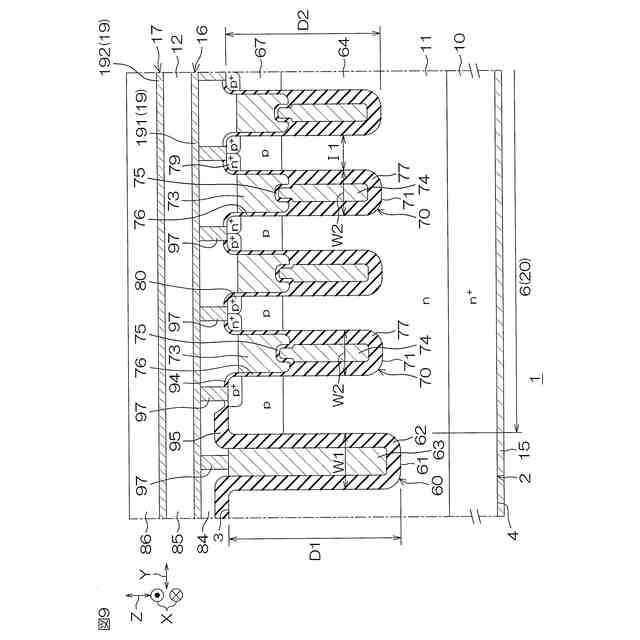 特許文献1は、第1主面を有するチップと、第1主面に設けられたダイオード領域と、ダイオード領域において第1主面に間隔を空けて形成された複数のダイオードトレンチ構造と、複数のダイオードトレンチ構造の間の領域においてpn接合部を有するダイオードとを含む、半導体装置を開示している。