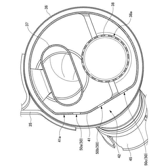 また、前記連通孔(50a,50b,50c)は、前記マフラ(33)の側面視で、前記インナパイプ(37,38)の端部の近傍に形成されている点に第2の特徴がある。