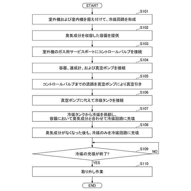 また、前記臭気成分充填ステップよりも前に、前記冷凍装置に圧力測定器を接続すると共に前記圧力測定器に真空ポンプを接続して、前記真空ポンプにより前記冷凍装置と前記真空ポンプとの間の流路の真空引きを行う真空引きステップを有する。