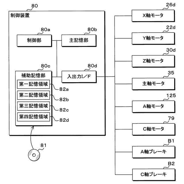 本開示においては、制御装置は、第三指令が保持部の移動を示す指令である場合、制動解除位置を記憶し、加工実行時に、記憶した制動解除位置に基づいて、主軸が制動解除位置に到達したか否か判定する。