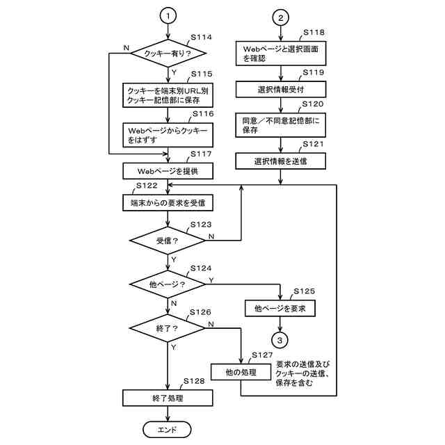 このように、クッキーはWebページの利用者の利便性を向上させる上で有用な情報であるが、Webページの利用時における利用者に関する情報(個人情報)であるため、その利用に際しては、利用者の同意を得る必要がある。このため、Webページの利用に際して、当該Webページを提供するサーバ装置が、クッキーの使用に対する同意/不同意の選択入力を求める選択画面(ポップアップ画面)を、利用者のPCやスマートフォンに提供し、利用者に対して、同意/不同意の選択入力を求めている。しかしながら、連携する複数のドメイン(サーバ装置)からユーザがサービスの提供を受ける場合に、各ドメインからの選択入力の求めに応じることは面倒である。このため、後に記す特許文献1には、連携する複数のドメインからユーザがサービスの提供を受ける場合に、ユーザが各ドメインにアクセスする毎にユーザからのクッキーの利用の同意の取得を不要にした情報処理装置及びプログラムに関する発明が開示されている。
