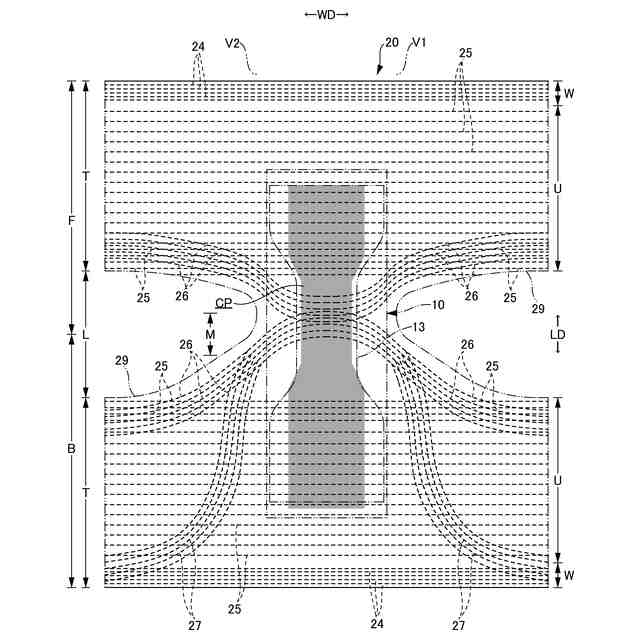 外装体の伸縮構造が糸状や帯状等の細長状の弾性部材により形成される場合、弾性部材は伸縮方向に沿う所定のパターンで配置され、それが間隔を空けて複数配置されることにより伸縮領域が形成される。例えば、胴領域を胴周り方向に締め付ける場合、弾性部材は幅方向に沿って配置される。また、脚開口の縁部を脚周り方向に締め付ける場合、弾性部材は、一方のサイドシール部から脚開口の縁に沿って幅方向中央に向かい、幅方向中央を横断して他方の脚開口に向かい、他方の脚開口に沿って他方のサイドシール部に至るパターンで配置される。