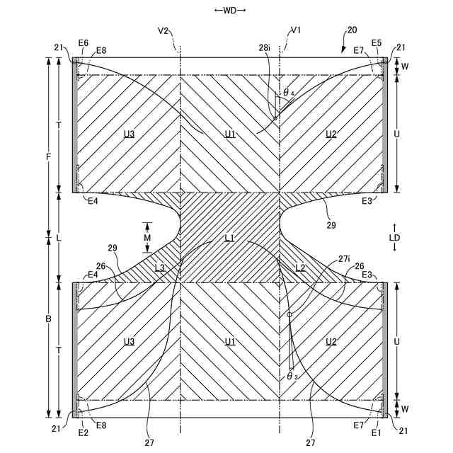 前記変曲点又は前記直線部分は、前記左領域の幅方向の中央側及び前記右領域の幅方向の中央側にそれぞれ位置しており、