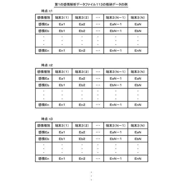 所定の分析タイミングにおいて、前記収集データ記憶手段の前記感情認識用データを用いて、所定の集計時点ごとであって、前記端末装置ごとに、前記所定の感情種別ごとのレベル値を算出し、第1の感情解析データ記憶手段に記録する感情認識手段と、