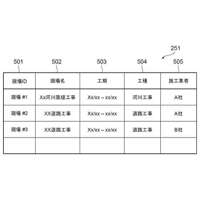 本発明の実施例1における、現場管理テーブルのデータ構造例。