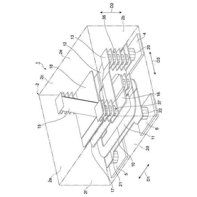 (5)上記(1)~(4)のいずれか一つの電子部品において、積層方向から見て、第一接続導体の幅と第二接続導体の幅とが異なっていてもよい。この構成では、インダクタンス及びキャパシタンスの調整を行うことができる。