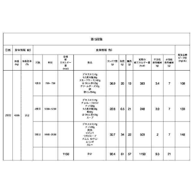 上記n段階の各段階で、n段階から選ばれた2つの段階で摂取する食品及び/又は食事に関する栄養条件が異なるように食事情報(70)を設定する、