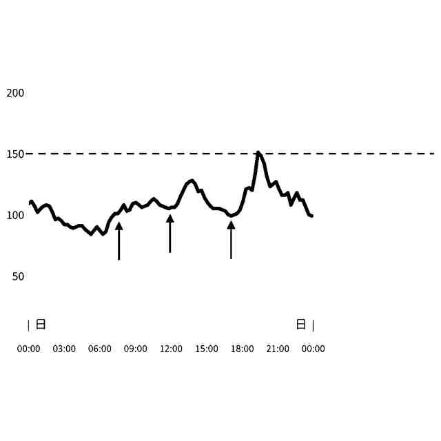 非特許文献1,2,3の記載から、単に糖尿病の発症を予防するだけでなく老化防止にも血糖値スパイクを避ける食生活が望ましいことは徐々に認知されてきたと言える。しかし、一般の健康診断では空腹時血糖値を測定するため血糖値スパイクは見逃される(非特許文献3)。非特許文献3に記載されたチェック方法では、血糖値が180mg/dL以上になった時間帯の有無を判定することはできるが、食後の血糖ピーク値は測定されず、食後の血糖値の実際の変化(血糖曲線)に相当するデータは取得できない。