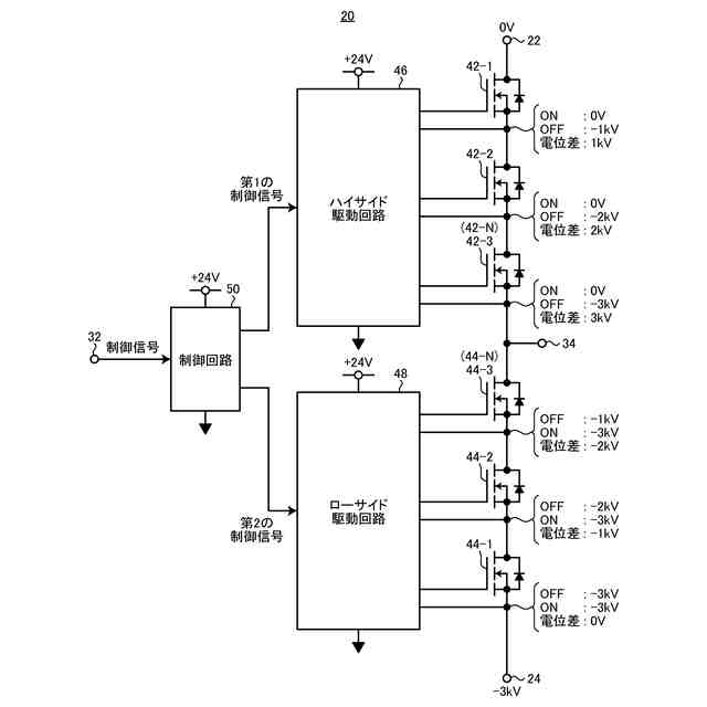 また、このような対策のため、高電圧のパルスを発生するインバータ装置は、絶縁型の伝送回路を直列に複数個接続したり、絶縁型DC/DCコンバータを直列に複数個接続したりすることにより、個々の回路のコモンモードノイズの負担を軽減することができる(例えば、特許文献2及び非特許文献1)。しかし、各回路は、入出力間の寄生容量にばらつきがあるので、容量の大きい回路の入出力間より、容量の小さい回路の入出力間に大きな電圧が印加される。従って、高電圧のパルスを発生するインバータ装置は、絶縁型の伝送回路を直列に複数個接続したり、DC/DCコンバータを直列に複数個接続したりした場合であっても、個々の回路のコモンモードノイズの負担を軽減することが好ましい。