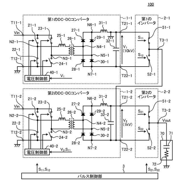 パルス電源装置100は、第1のDC-DCコンバータ1-1と、第2のDC-DCコンバータ1-2と、第1のインバータ2-1と、第2のインバータ2-2と、パルス制御部3とを備える。
