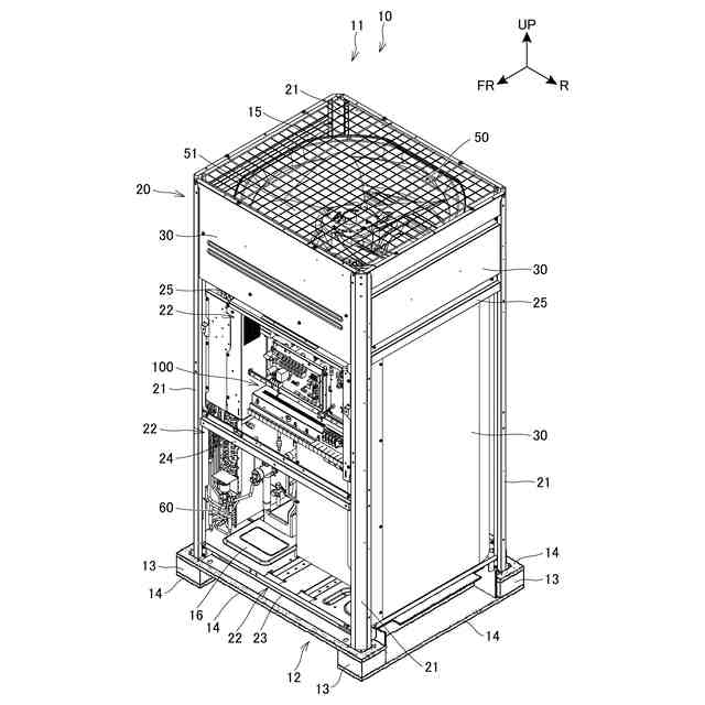 以下、図面を参照して本開示の実施形態について説明する。各図には、室外機10の設置状態における方向を矢印で示している。符号UPは上方を示し、符号FRは前方を示し、符号Rは右方を示す。説明中、前後左右および上下といった方向の記載は、特に記載がなければ、図1の室外機10を基準とする。
