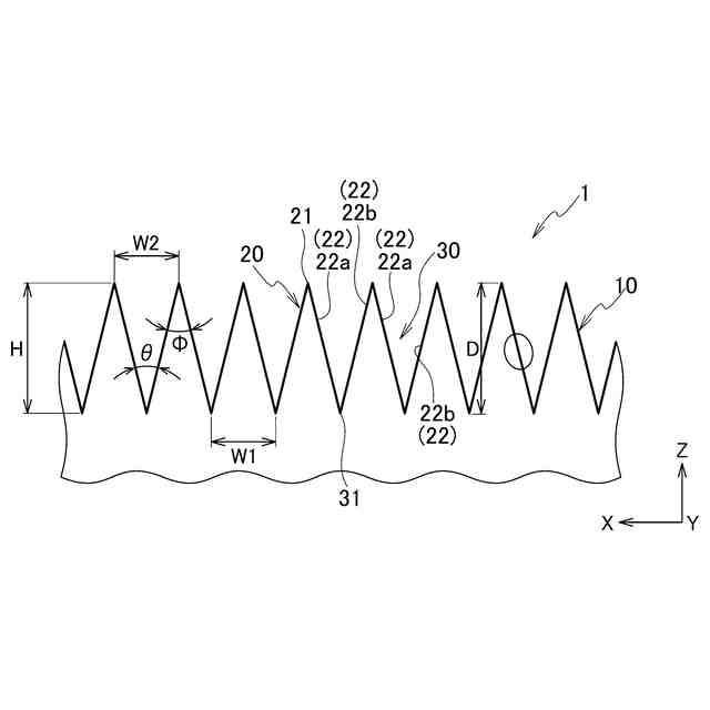 前記複数の凸部の各々は、前記断面視において、前記凸部に隣接する一方の凹部の前記第1壁部と、前記凸部に隣接する他方の凹部の前記第2壁部とによって形成され、前記頂部に向かって幅が狭くなるように突出し、
