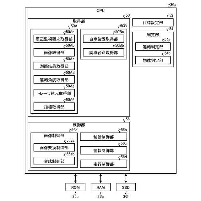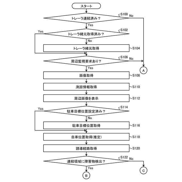 従来、牽引車両(トラクタ)の後部に旋回自在に連結されて牽引される被牽引車両(トレーラ)が知られている。牽引車両が被牽引車両を連結していない場合、牽引車両に搭乗する運転者は、サイドミラー等を視認したり、牽引車両の後部に設けられた撮像部(カメラ)で撮像した画像を運転席の表示装置を介して視認したりすることで後方確認を行いながら後退走行することができる。しかしながら、牽引車両が被牽引車両を連結されている場合は、サイドミラー等の視認領域や撮像部の撮像領域の一部または全てが被牽引車両によって遮られて死角になってしまう場合がある。そこで、保存しておいた画像と現在の画像とを用いて死角領域を補って表示装置に表示することにより、後退走行時の後方視認性を向上する技術が提案されている。