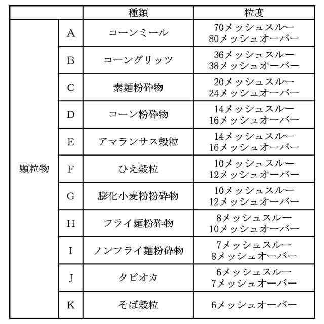 前記顆粒物は、穀粒、穀粒粉砕物、澱粉粒、即席麺粉砕物、乾麺粉砕物、パン粉及び膨化物粉砕物から選択される1種以上であり、