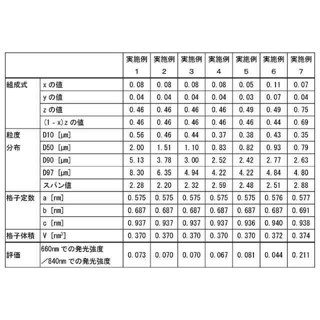上記蛍光体は、D97が所定値以下となるような蛍光体微粒子で構成される粉体であるものの、蛍光体組成中のLaの量が比較的多くなっていることによって、可視領域における発光を抑制し、近赤外領域における発光を優位なものとした蛍光体となっている。
