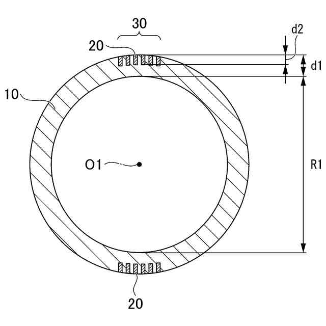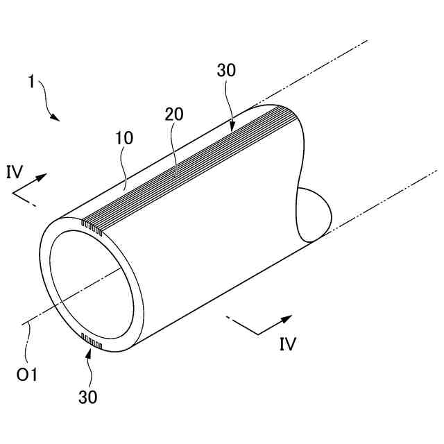 図1に示すように、本開示の樹脂管1は、筒状の管本体10と、管本体10の外面に形成された帯状部20とを備える。