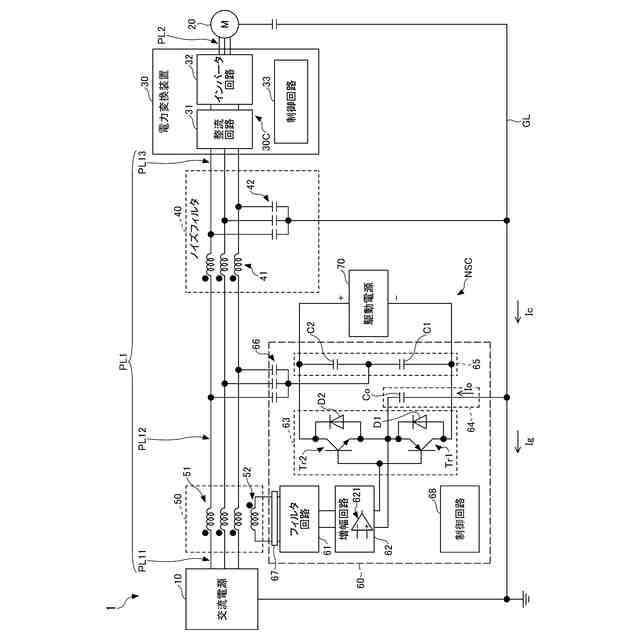 従来、コモンモードノイズを検出し、検出したコモンモードノイズに対して補償電流或いは補償電圧をコモンモードノイズが流れる経路に出力することにより、コモンモードノイズを低減するノイズ抑制技術が知られている。(例えば、特許文献1参照)。