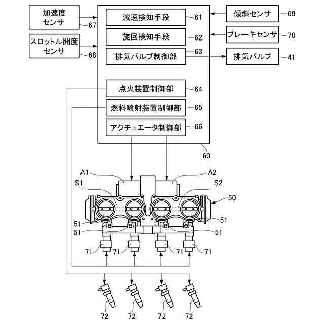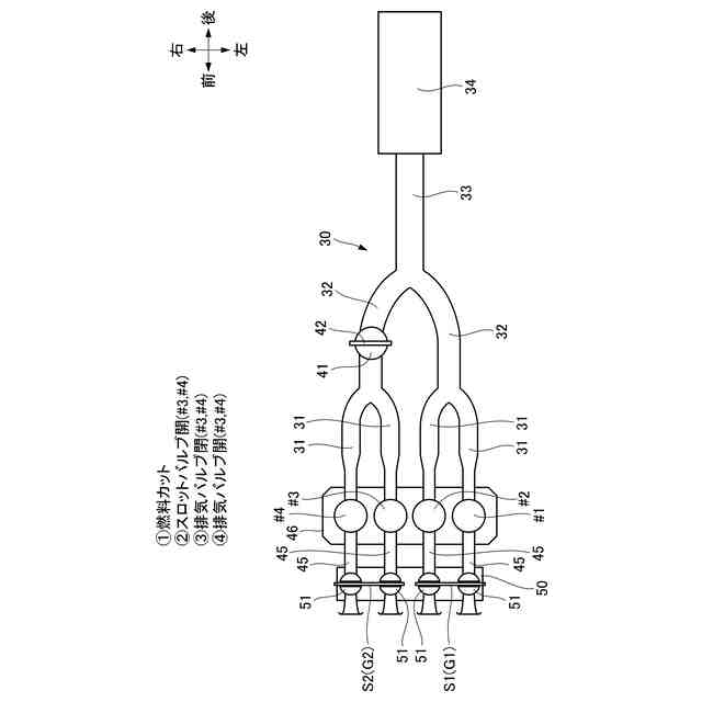 また、前記第1アクチュエータ(A1)、前記第2アクチュエータ(A2)、前記排気バルブ(41)および燃料噴射装置(71)を駆動制御する制御装置(60)と、前記車両(1)が減速状態にあることを検知する減速検知手段(61)とを備え、前記制御装置(60)は、前記減速検知手段(61)によって前記車両(1)が減速中であることを検知すると、前記燃料噴射装置(71)による燃料噴射をカットすると共に、前記第1グループ(G1)または前記第2グループ(G2)のうちの前記排気バルブ(41)が設けられている方の前記スロットルバルブ(51)を開き、かつ前記排気バルブ(41)を閉じる点に第2の特徴がある。