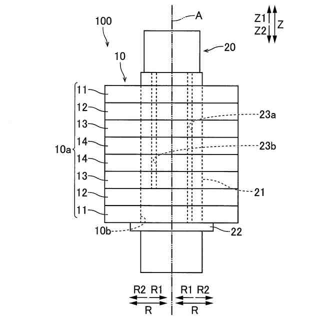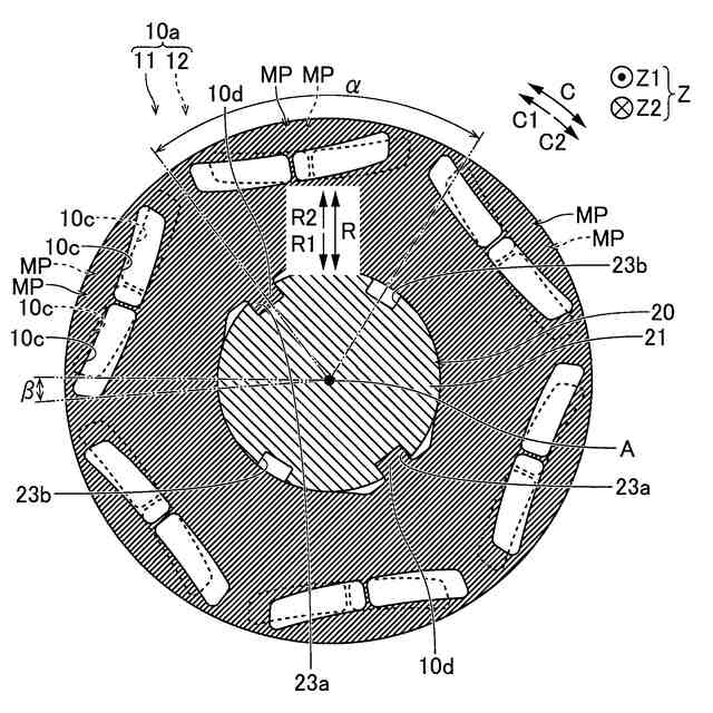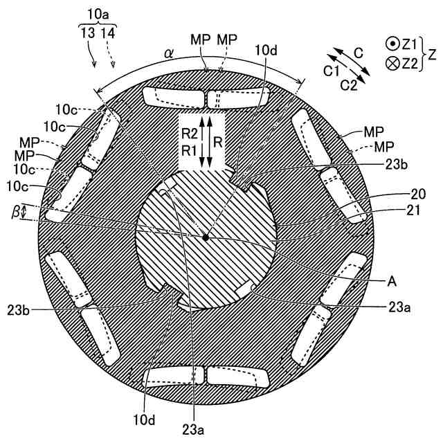 【解決手段】このロータ100では、複数のロータコアブロック部10aは、キー10dが第1キー溝23aと係合する第1ロータコアブロック部11と、キー10dが第1キー溝23aと係合するとともに第1ロータコアブロック部11をZ方向に裏返して配置され、C方向において第1ロータコアブロック部11とは磁極MPの位置がずれた第2ロータコアブロック部12と、キー10dが第2キー溝23bと係合し、C方向において第1ロータコアブロック部11および第2ロータコアブロック部12とは磁極MPの位置がずれた第3ロータコアブロック部13と、を含む。
