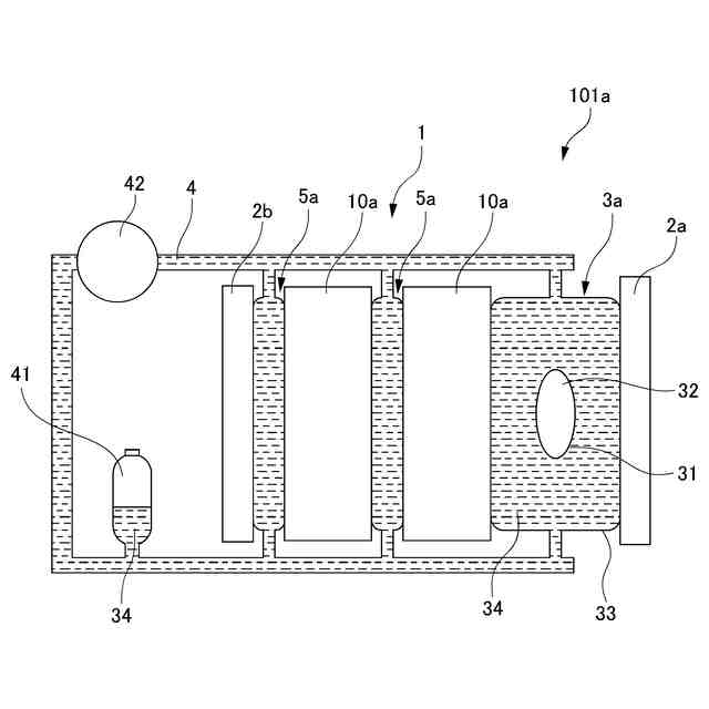 本発明者らは、バッテリセルとバッテリセルとの間もしくはバッテリセルとエンドプレートとの間に、内側弾性容器と外側弾性容器を有する二重構造で、内側弾性容器に気体が充填され、内側弾性容器の外面と外側弾性容器の内面との間に液体が充填された第1緩衝材を配置し、外側弾性容器を、アキュームレータを有する循環配管に接続することによって上記課題を解決できることを見出し、本発明を完成するに至った。したがって、本発明は、次のものを提供する。