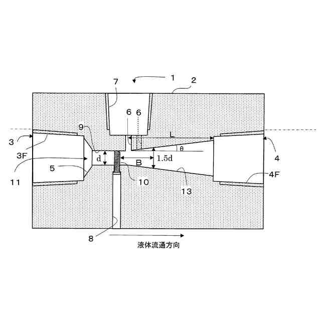 絞り部内に配置され、ねじ山ピッチが0.20mm以上0.40mm以下、ねじ谷深さが0.20mm以上0.40mm以下、呼び径が1.0mm以上2.0mm以下のねじ部が外周面に形成されたキャビテーションねじ部材と、