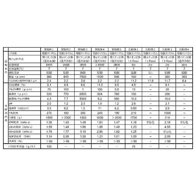水硝子のような珪酸アルカリ溶液からアルカリ成分を除去すると、その安定性が損なわれ、増粘、ゲル化が起こることは従来公知である。これは珪酸イオンが中性付近で非常に不安定となり、珪酸同士のシロキサン結合形成等の重合反応が進行するためであり、さらにアルカリ成分を除去したり、酸を加える等して酸性下とすることで、再度安定化する。珪酸アルカリを予め多量の酸と混ぜてpH2未満とした後に、ヒドロキシル型の塩基性陰イオン交換樹脂および水素型の酸性陽イオン交換樹脂を任意の順序で接触させて珪酸水溶液を得ることが知られている(例えば、特許文献2を参照)。しかしながら、陰イオン交換樹脂と接触させる方法では、残存する酸の量の調整が困難であるとともに、陰イオン交換樹脂周辺で局所的に中性付近あるいはそれに準じるような高pHな環境が生じてゲル状物が発生し、高濃度で安定な珪酸液を得ることは困難であった。