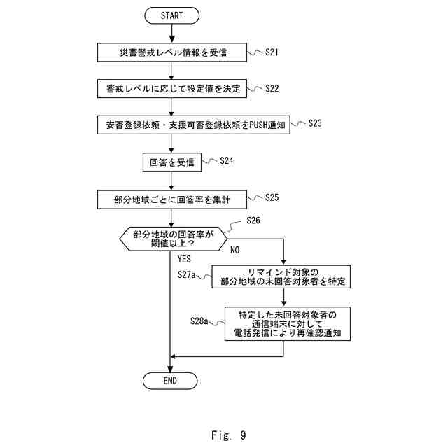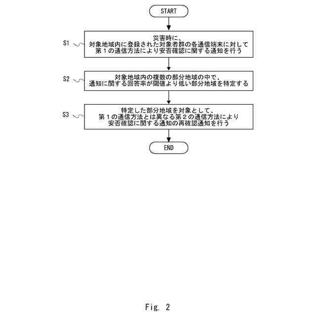 災害時に、対象地域内に登録された対象者群の各通信端末に対して、第1の通信方法により安否確認に関する通知を行い、