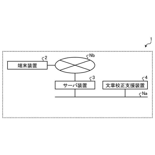 サーバ装置3と文章校正支援装置4とは、LAN(Local Area Network)等のネットワークNaを介して互いに通信可能に接続されている。また、サーバ装置3は、インターネット等のネットワークNbを介して、端末装置2と通信可能に接続される。なお、サーバ装置3は、文章校正支援装置4と一体の装置であってもよい。また、端末装置2は、サーバ装置3及び文章校正支援装置4と同一のネットワークに接続されてもよい。なお、端末装置2の台数は図示例に限定されないものとする。