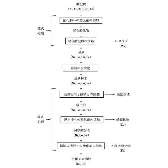 ニッケルおよびコバルトからなる群から選ばれる少なくとも1種ならびにマンガンである有価元素と、銅および鉄である不純物元素とを含有する酸化物に、還元剤を添加して、混合酸化物を得て、