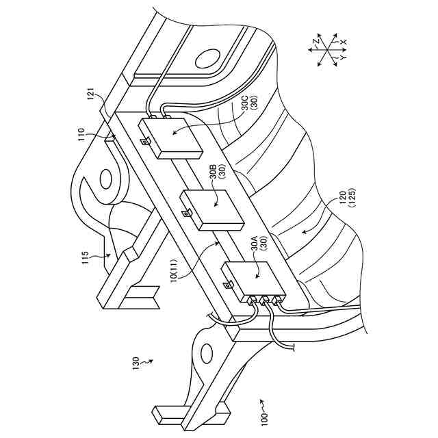 図1は、実施形態に係るワイヤハーネスWHが適用される車両100の斜視図であり、図2は、車両100の斜視図であって、制御装置30が取り外された状態の図である。図1、2に示される本実施形態のワイヤハーネスWHは、車両100に適用され、当該車両100に搭載される各装置間を接続し電源供給や信号通信に用いられるものである。本実施形態のワイヤハーネスWHは、例えば、車両100のダッシュパネル120に設けられると共に、車両100のインストルメントパネル(不図示)の内部に設置される。ダッシュパネル120は、車両100のエンジンルーム130と車室内(キャビン)とを仕切る隔壁であり、車両100の構造部材(骨格部材)を構成している。