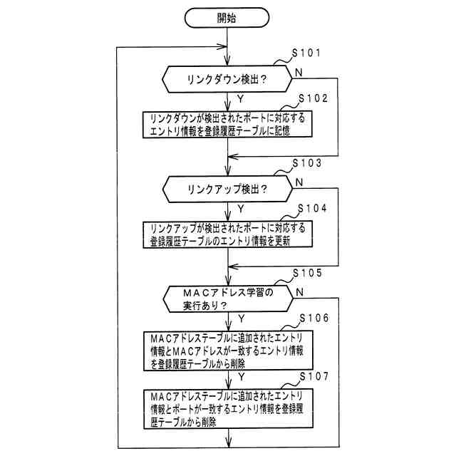 前記管理手段は、リンクダウンが検出されたことに基づいて、リンクダウンが検出されたポートに対応するエントリ情報を前記記憶部に記憶させる