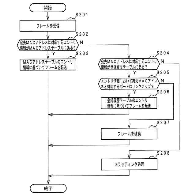 受信したフレームの宛先MACアドレスに対応するエントリ情報が前記MACアドレステーブルと前記記憶部とのいずれにも記憶されていない場合、受信したフレームのフラッディング処理を実行する