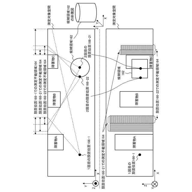 また、上記目的を達成する更なる見地において、本発明の一態様に係る三次元スキャナの設置位置設定支援プログラムは、三次元スキャナによる測定対象空間に対する過去の測定結果と関連し、前記三次元スキャナを次に設置する位置の候補となる候補領域を表す情報を取得する候補領域取得処理と、前記候補領域に含まれる複数の位置のいずれかに前記三次元スキャナを設置した場合において、障害物によって生じる前記三次元スキャナによる測定不能な領域を、前記複数の位置の個々に関して予測する予測処理と、予測された前記測定不能な領域の大きさが基準を満たす位置を、前記複数の位置のなかから特定する特定処理と、特定された位置を利用者に提示する提示処理と、をコンピュータに実行させる。