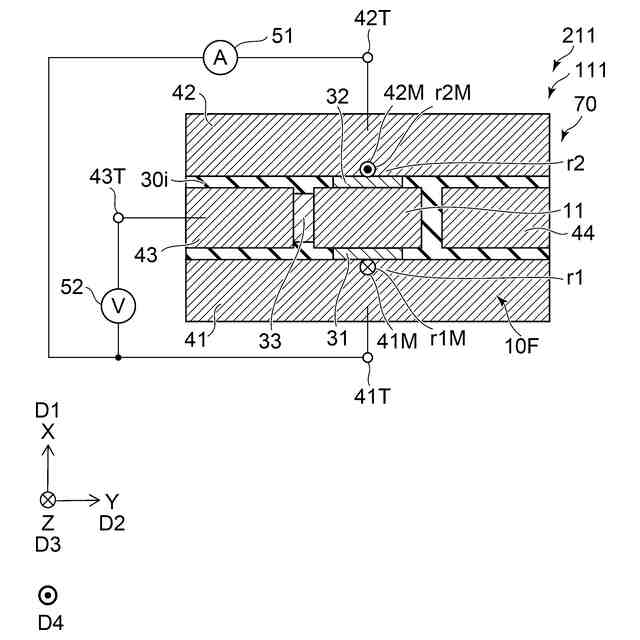 磁気記録媒体80に対して垂直な方向をZ軸方向とする。Z軸方向に対して垂直な1つの方向をX軸方向とする。Z軸方向及びX軸方向に対して垂直な方向をY軸方向とする。Z軸方向は、例えば、ハイト方向である。X軸方向は、例えば、ダウントラック方向で良い。Y軸方向は、例えば、クロストラック方向で良い。媒体対向面10Fは、例えば、X-Y平面に沿う。図1は、媒体対向面10Fからみた再生部70の平面図に対応する。