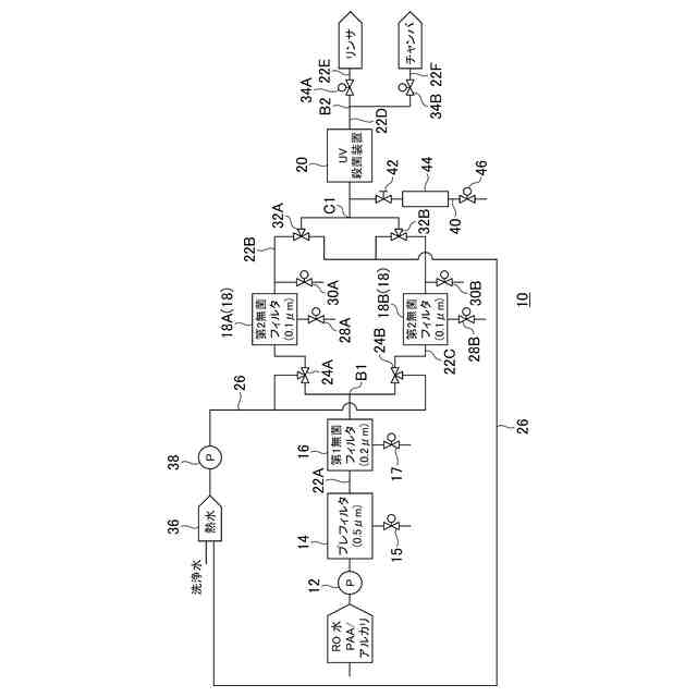 上記水滅菌手段は、第1無菌フィルタと、上記第1無菌フィルタの下流側に設けられ、水に紫外線を照射して殺菌する紫外線殺菌手段と、上記第1無菌フィルタと上記紫外線殺菌手段との間に、切り替え可能に並列に複数設けられた第2無菌フィルタと、上記紫外線殺菌手段の上流側または下流側に設けられ、サンプリングした水中の微生物数を検査する微生物検査手段を備え、