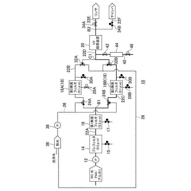 無菌環境下で容器に内容物を充填する無菌(アセプティック)充填システムにおいては、無菌水が多くの用途に使用されている。例えば、容器を洗浄する容器洗浄工程において、容器やキャップを殺菌するために過酸化水素溶液などの薬剤が噴霧されており、それを洗い流すために無菌水が使用されている。他にも無菌チャンバのすすぎ水や潤滑液などにも無菌水が使用されており、その用途は多い。従来、この無菌水は、超高温(UHT)殺菌装置によって製造されてきたが、この超高温殺菌装置では、水を超高温で加熱するために多くのエネルギーを使用する必要があり、多くの二酸化炭素の排出に繋がっている。近年、SDGsにおいて「13.気候変動に具体的な対策を」が挙げられるように、環境負荷低減のために二酸化炭素の排出量削減が求められている。さらに、超高温(UHT)殺菌装置は、イニシャルコストが高く、多くのエネルギーを使用するのでランニングコストが高いという問題もある。これらの問題に対応するため、超高温(UHT)殺菌処理を行わずに無菌フィルタと紫外線殺菌機を併用した水殺菌機が公知である(特許文献1参照)。