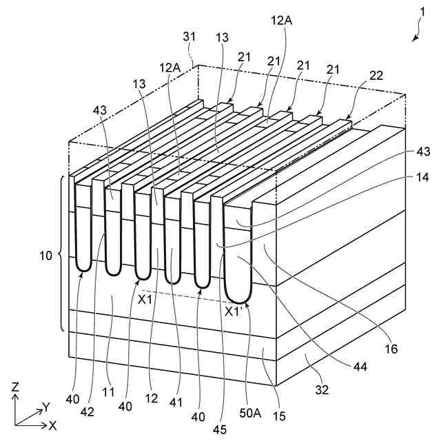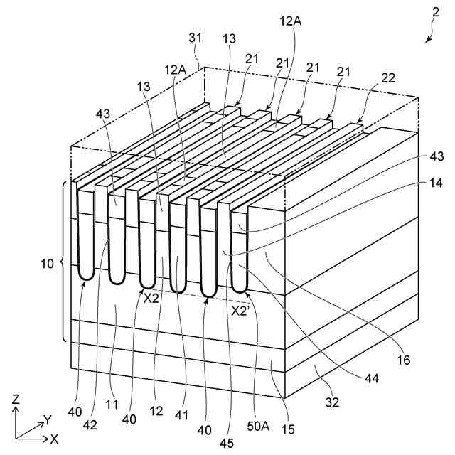 半導体層10は、第3方向Zにおいて、上部電極31と下部電極32との間に位置する。半導体層10は、第1方向Xに並び、第2方向Yに延びる複数のメサ部21、22を有する。第1方向X及び第2方向Yは、第3方向Zに垂直な面内で互いに直交する。半導体層10は、例えば、シリコン層である。半導体層10は、炭化シリコン層、または窒化ガリウム層であってもよい。本明細書では、半導体層10の導電型において、第1導電型をn型、第2導電型をp型として説明するが、第1導電型をp型、第2導電型をn型としてもよい。