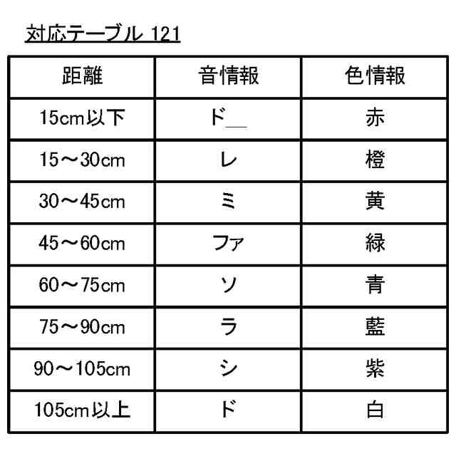実施形態1に係る発音装置により測定された距離に応じて発光部の色が変化する例を示す図である。