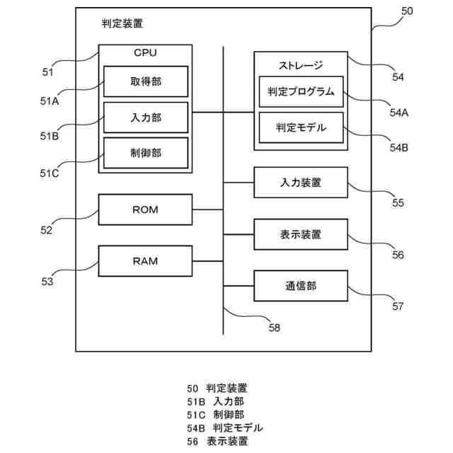 図1は、判定装置50のハードウェア構成を示すブロック図である。判定装置50には、一例として、サーバコンピュータ、若しくはPC(Personal Computer)等の汎用的なコンピュータ装置、又はスマートフォン、若しくはタブレット端末等の携帯端末が適用される。本実施形態では、判定装置50を「PC」としている。