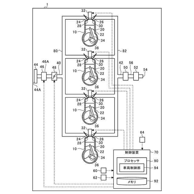 図1は、第1実施形態にかかる車両1の構成を示す概略図である。車両1は、駆動源としてエンジン10を備えるエンジン自動車であってもよいし、駆動源としてエンジン10とモータジェネレータ(不図示)とを備えるハイブリッド自動車であってもよい。なお、第1実施形態において、車両1のことを、自車両という場合がある。