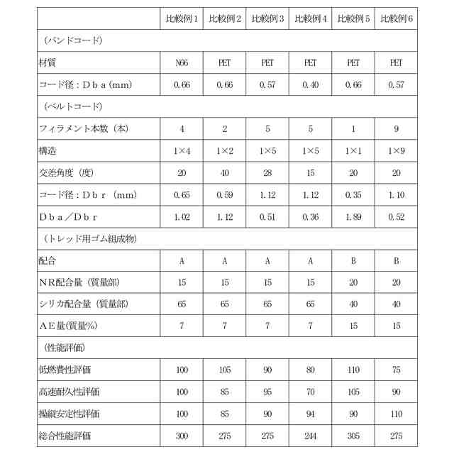 【解決手段】カーカスコードを備えるカーカスと、ベルトコードを備えカーカスのタイヤ半径方向外側に設けられるベルトと、バンドコードを備ベルトのタイヤ半径方向外側に設けられるバンドと、バンドのタイヤ半径方向外側に設けられるトレッドとを備えるタイヤであって、バンドコードはポリエチレンテレフタレート繊維を含んでおり、トレッドをタイヤ径方向に平面視したときにおける、タイヤ周方向とベルトコードの長手方向とがなす角度のうち、小さい方の角度である交差角度が、0度超、25度未満であり、ベルトコードは本以上、4本以下のフィラメントから構成されており、ベルトコード径Dbr(mm)に対するバンドコード径Dba(mm)の比(Dba/Dbr)が、下記の(1式)を満たしているタイヤ。