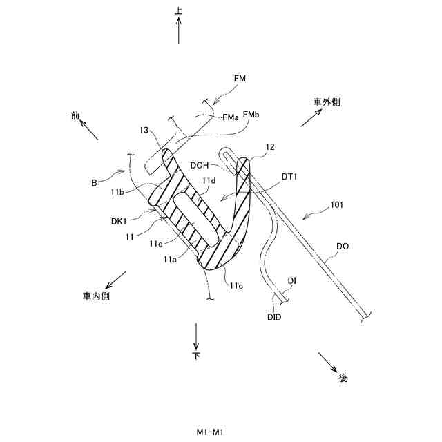 しかしながら、ドリップウェザーストリップ300を単純に延長しただけでは、図13に示すように、ドア201とボディBのレイアウトの関係上、ヒンジH1の直上部位においては、ドア201の閉時にはドア201がシールリップ307に干渉するため、シールリップ307の先端部307aから付根部307bまでをカット(切り落とし)する必要がある。