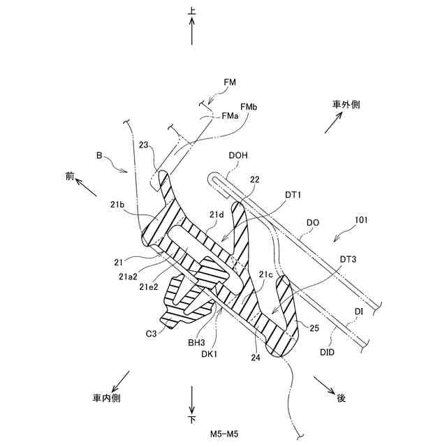 より詳細には、ヒンジH1の直上部位においては、ドア201閉時には、シールリップ307は破線で示すような撓み形態となり、その後ドア201開時にはドア201先端部がシールリップ307の、ドア201側の面をひっかくように開いていくため、シールリップ307が破損したり、ちぎれたりしてしまう。