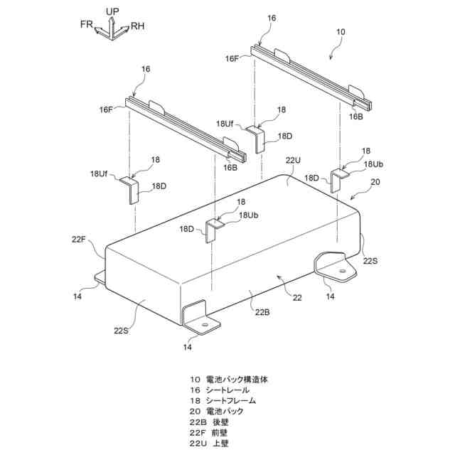 上記の目的を達成するために、本発明に係る第1の態様の電池パック構造体は、車両のフロアに固定された電池パックと、車両前後方向に延在し、前記電池パックの上壁に接触した状態で配置されたシートレールと、前記電池パックの前壁及び後壁と前記シートレールの前部及び後部とをそれぞれ連結した前後一対のシートフレームと、を備えている。