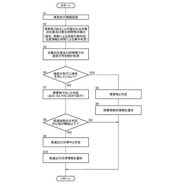 上記従来のシステムでは、障害物の検知は、車両毎の操作(ステアリング、アクセル、ブレーキ、ウインカー等)や操作に伴う挙動(加減速、前後左右加速度、ヨー加速度等)の情報、即ち、車両走行情報によって行われており、例えば、障害物に対する回避が疑われる車両走行情報が、同じ場所、同じ時間帯に見られることで、障害物と判定、検知されていた。しかしながら、障害物回避の車両走行情報と、高速道路の出口やサービスエリア、パーキングエリア等への進入口(以下、高速出口とする)へ向かう車両走行情報と、が類似しており、誤検知になりやすいといった課題があった。