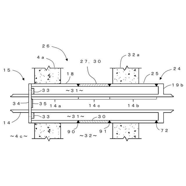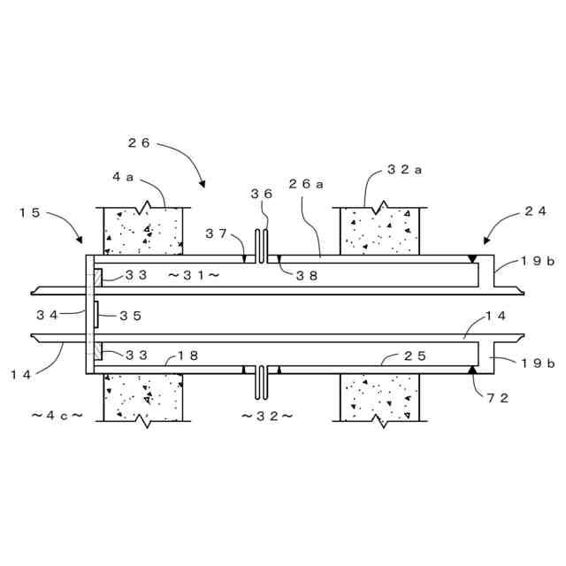 図13は、従来の第1の原子力プラント(ABWR)の鉄筋コンクリート製原子炉格納容器(RCCV)12のドライウェル貫通部15の構成の例を示す断面図である。図13において、ドライウェル壁4aを貫通するドライウェル壁防護スリーブ18が設けられている。ドライウェル壁防護スリーブ18は円筒状の配管である。ドライウェル壁防護スリーブ18は鋼製である。ドライウェル壁防護スリーブ18はプロセス配管14がドライウェル壁4aを貫通して通過するための通路を形成している(スリーブ機能)。また、ドライウェル壁防護スリーブ18はプロセス配管14がドライウェル壁防護スリーブ18の内部で破断した際に発生する可能性のある配管の衝突やジェットに耐えられる強度を有している。これよってドライウェル壁4aが損傷しないように防護する機能を有している(防護機能)。ドライウェル壁防護スリーブ18は一般には単にスリーブと呼ばれることが多いが以下では明確化のためドライウェル壁防護スリーブ18と呼ぶ。ドライウェル壁防護スリーブ18のドライウェル壁4aの外側の端はドライウェル壁貫通部端板19aによって気密に閉鎖されている。