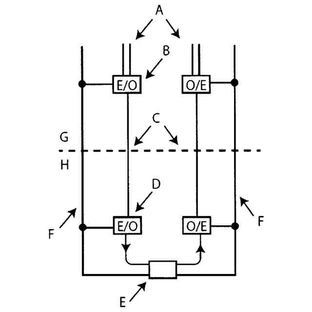 D 光信号から電子信号への変換器 E 電子装置 F 電源線 G 常温側
