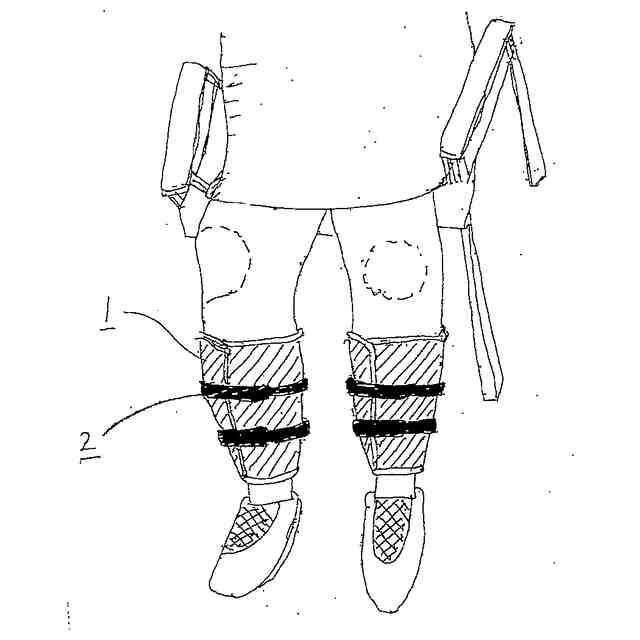 前記表布と裏布と中間布は平面略台形状に形成されると共に、これらをキルティング縫いすることによって離間しないよう一体連結し、車椅子の装着部材に当接する被介護者の腕又は足の何れかの部位に、前記平面略台形状の上辺長幅側を上方肘又は膝側とし、下辺短幅側を下方手首又は足首側として巻き付けるとともに、前記表布と裏布に対向配置された雌雄面ファスナーの係着及び解除によって着脱するものが記載されている。