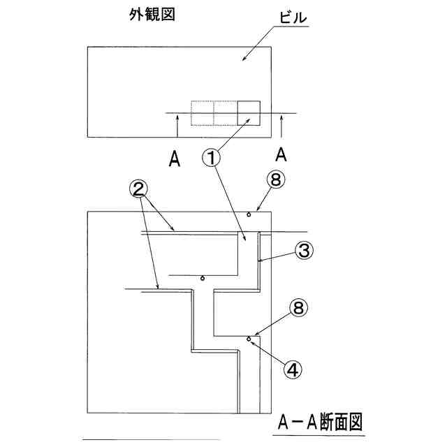 外観図 ビルの内部に縦穴(縦穴空洞)1を交互に下へと、作って置くことによりタンカーを数回に分けて降ろします。縦穴(縦穴空洞)1の上(天井部)に釣り金具4が設置されている