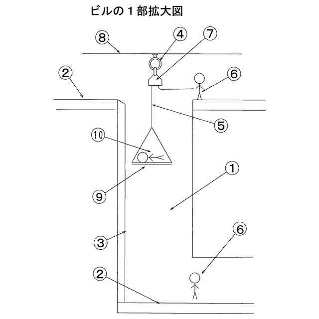 ビルの1部拡大図 ビルに縦穴(縦穴空洞)1が設置されており、この縦穴1の上の天上に釣り金具4が設置されており、この釣り金具4に専用釣り金具7を取り付け、専用釣り金具7から出ているロープにタンカー9を付けて、タンカー9に乗った救助する人10を降ろします。この縦穴空洞1にははしご3が付いており下へと降りることが出来ます。
